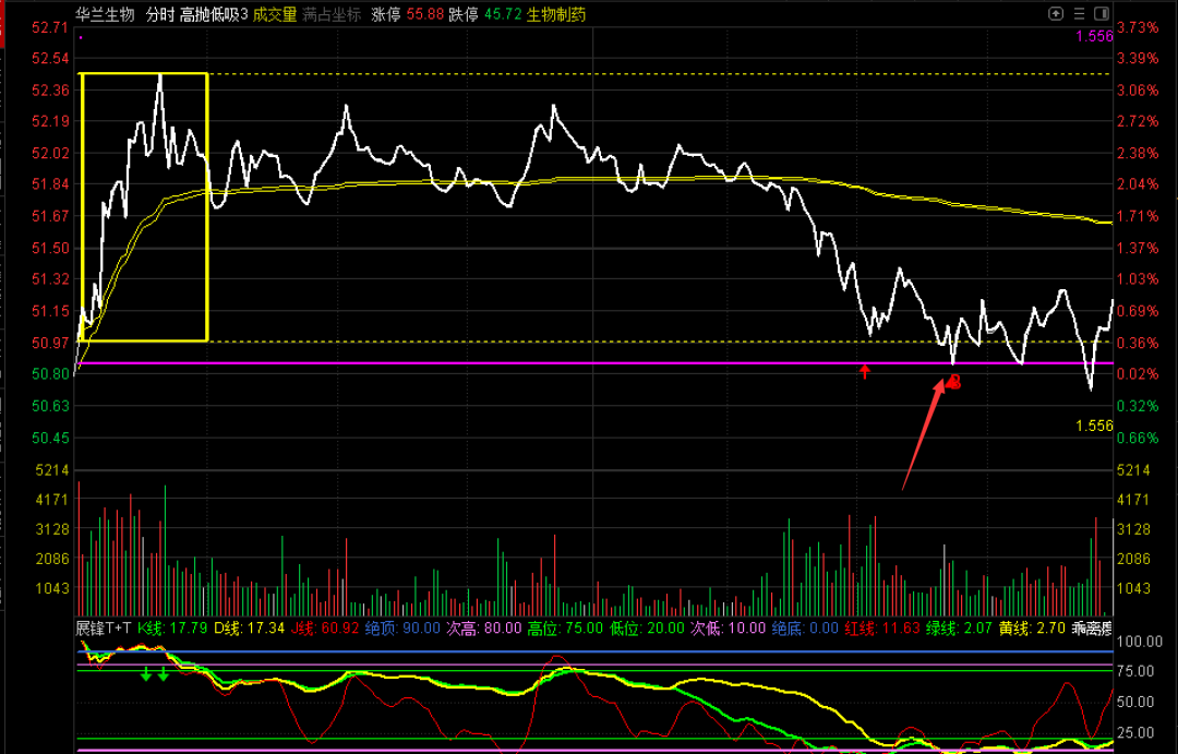 好多天都没有T过华兰生物了,因为在盘中的分时图上,它很长时间没有给信号了。其实,今天的这个买入我还是挺犹豫的。毕竟已经接近了14点附近,后来想想也就加1/3的仓,本就是无所谓的事情,就当是给明天准备一个T的机会吧,我的买入价是50.92元,比信号点位50.86元略高了一点。明天看盘中情况再做处理吧!