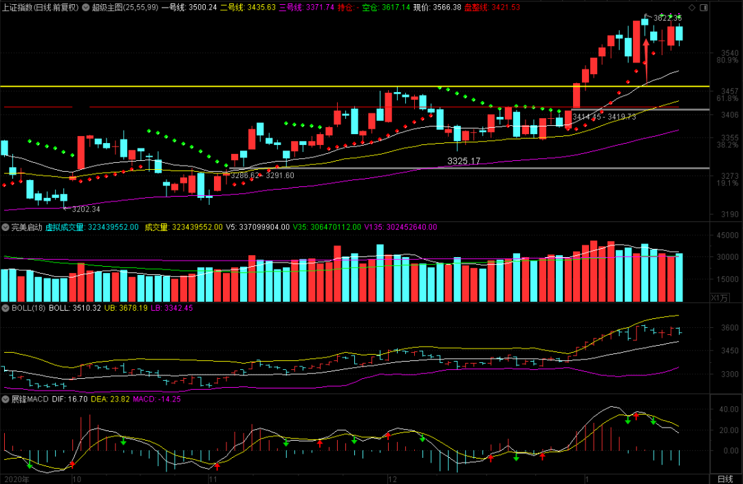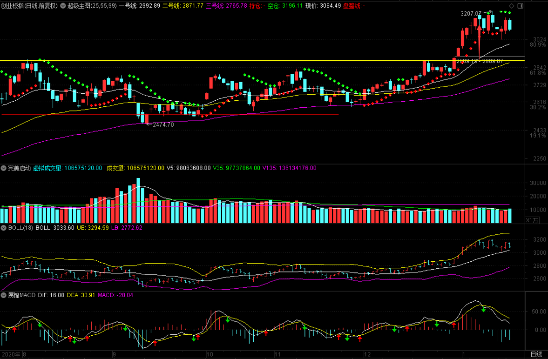 我在上面的这张图中,用标识画了一个见顶的标志。其实,懂的人一眼就看出是怎么回事儿。不懂的人只能今天我讲课的时候讲一讲,是一种非常简单的拐点研判。用在个股上也是一样,但要找好N字的高点,那样画出来才能够更加的准确。既然是拐点,那就有上拐和下拐的区别,前面那张图是上证指数的,和创业板的这张比较来看,准确度都非常的高!