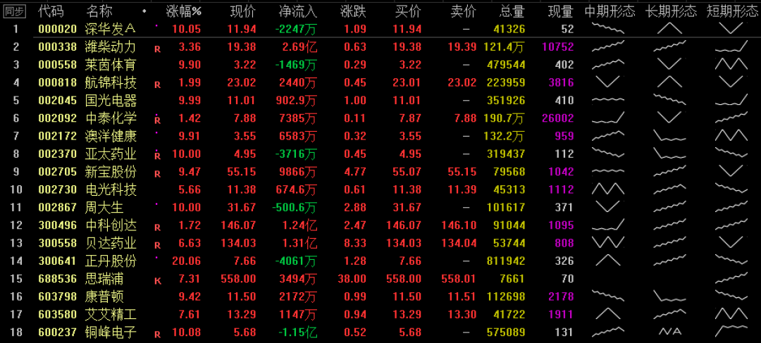 沪深两市今天一共有18只个股发出日线级别高抛信号,除了一些涨停板的个股之外,希望能给大家一个有益的参考,这些股中的绝大部分都不可以再追,正所谓君子不立危墙之下,绕开这些已经有高抛信号的个股也很必要,虽然我发明的日线高抛信号不是绝对的东西,但相对提示作用还是很强的!今天就写到这里,稍后一直播讲课再说! 免责声明:本文所有内容都是展锋私人操盘记录,不代表任何机构观点和个股推荐,持仓个股随时卖出,切勿跟随买入,容易出现巨额亏损!据此入市者,请风险自担!