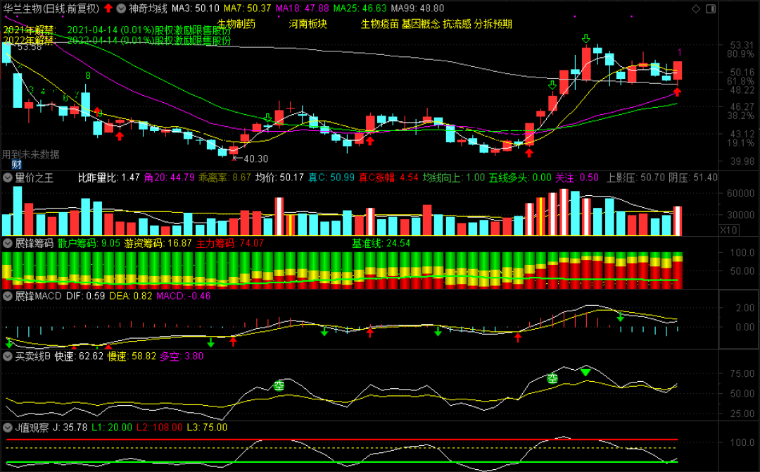 昨天比较担心华兰生物会继续下挫,50.50元早盘先卖出了15,000股加仓,虽然获利才有1.10元左右,但总比闷在里面要强;下午在51.28元又卖出了15,000股加仓,获利大概有1.23元左右。还有15,000股是50.92元加仓的,由于没有赚上一块钱或以上的收益,所以我暂时保留了,看看下周该股怎么个走向,再决定这个加仓的去留!