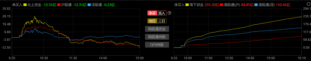 今日北上资金净流出-12.55亿,沪股通流出了-12.31亿,深股通流出了-0.23亿。南下资金继续维持200亿以上,今天净流入+235.3亿,这对A股而言,失血作用非常明显。前面我已经说过,为什么会出现这样的情况,相对估值和绝对估值角度讲,A股中的所谓核心价值品种,已经不具备很好的性价比,所以资金选择流向港股,也是一个无奈的选择!
