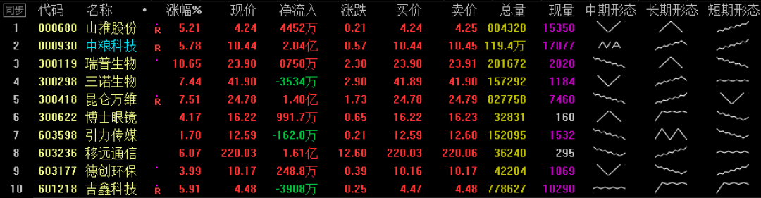 专做主升浪选股系统今天终于完成测试,我打算把它和买卖线B做成相辅相成的东西。今天一共有10只个股发出了主升浪红柱提示,其中300119瑞普生物由于有绿色高发信号发出,所以只能暂时性做剔除,剩余个股可以详细翻译一下基本面的情况,如果没有太大的利空出现,明日可以用分时高抛低吸指标顶盘中低吸点,看看是不是能够有所获益?