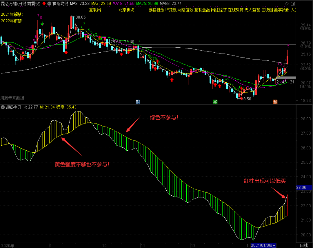当然,这是一种非常不错的选股方法,但没有其它辅助指标跟随的情况下,不建议普通投资者入场参与。只做一个选股参考就好了,因为一套系统的养成并不是一天两天的事儿,需要长时间在这个市场中进行磨砺。通过超级主升指标,你也完全可以判断一只个股现在走在什么样的情况里,辅助研判的功能还是非常不错的,需要细细的琢磨一下。今天就暂时写这么多吧,一会儿直播课堂上再多讲一些!
