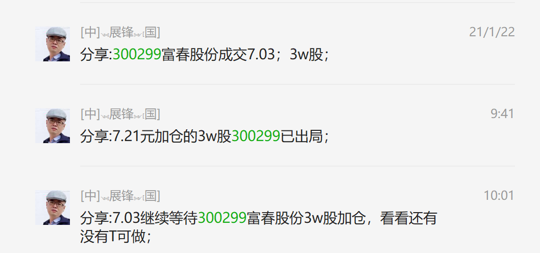 1月22日7.03元加仓的3万股富春股份,今天在7.21元才算T出去,这个“故事大王”,没有随着手游板块出现大幅回升,但我的原则依旧没有改变,到7.03元我就加仓,涨+2.5%或以上,我就把它T出去。所以今天尾盘的时候7.03元我又买回了3万股,谁说2.5%不是肉?你T4次的话就是10%,我T了它多少次,现在我自己都不记得了!