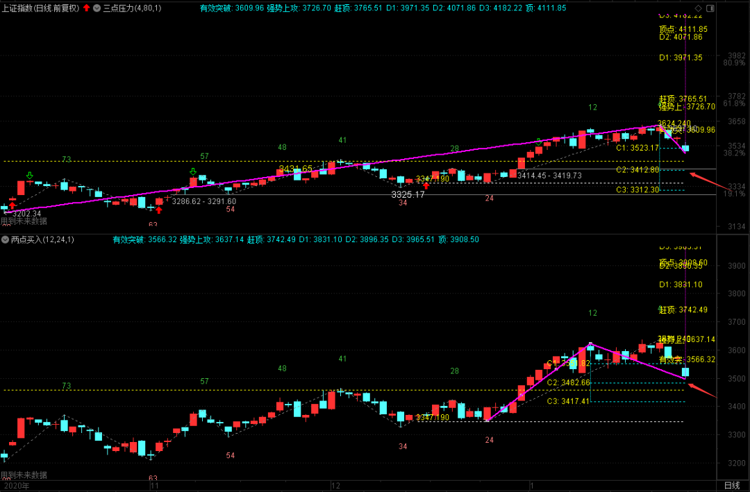 我今天给主板画了两张结构图,一张取起点3202.34,一张取近期低点3348.35。从这两张图我们不难看出,3523.17跌破了以后,如果不能快速回收的话,3482.66和3412.80,或将是接下来两个下落的支点。就结构角度而言,其实大盘今天的下落幅度已经够了,明天上午如果能够再往下快探一下的话,短期的反弹也就会马上来临,高度先看60分钟的2号线吧!