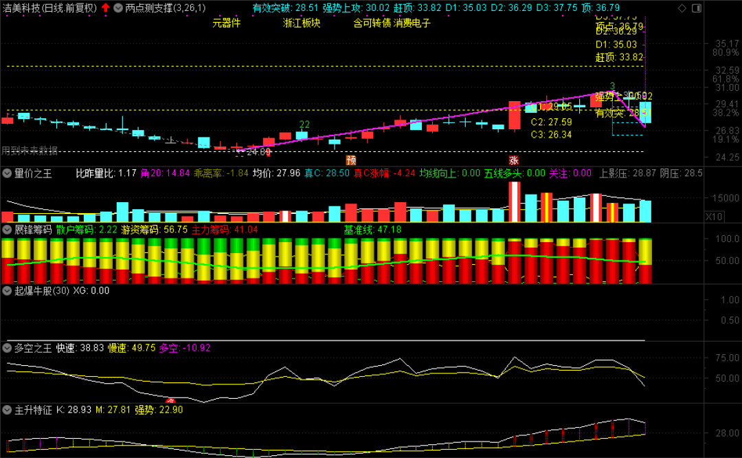 昨天在公众号上点评了洁美科技,今天这股票特别给面子,收盘跌了-7.66%,我是看了个一头雾水,基本面上业绩大幅上升,而且是芯片产业链载带细分领域龙头,也能跌个稀里哗啦,着实叫我有些看不懂了。技术面上,该股依旧在主升特征之内,今天强度22.90,散户筹码增加了2.22,主力筹码变为41.04,如果谁看懂了这只股票,不妨在文后和我讨论一下。