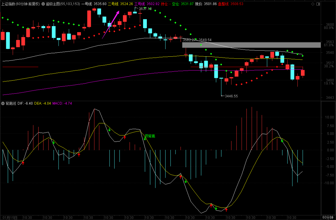 A股今天跌的没话说,最低打到3465附近,收盘虽然也回收了一些,但看上去似乎并不乐观,我个人还是那个判断:60分钟二号线不收复,就不要指望什么!从小时级别指标来看,正常情况下,这里应该有一个反弹,如果能够收复二号线3524.26的话,明天日线差不多能看到3581点附近。否则,就只能继续慢慢的看戏。