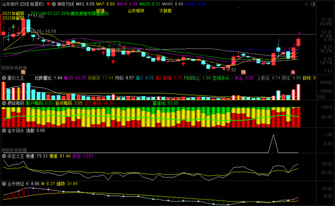 下午在分时均价线9.53元买了点山东玻纤,主要是主升特征已经了该股,而且是第1天的预警,看看筹码和各项指标都还不错。而且基本面上业绩预增的公告已经出过了,筹码方面也是比较不错的。所以,买入后看看下个交易日有没有向上冲击的可能?当然,这也要看主力的意愿,再好的姿态,如果主力不想往上拉的话,也是没有用的。
