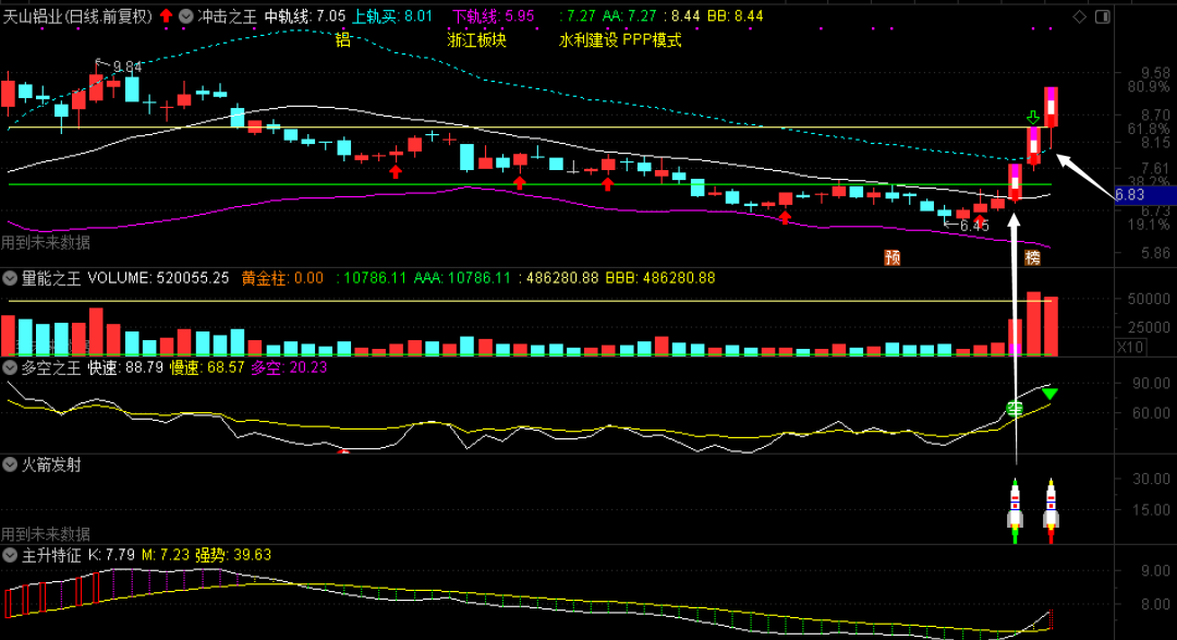 天山铝业在上周四我就发现了该股,当时该股在7.27元附近徘徊,而后快速向上封上涨停板。次日略下探后再度上封涨停板,很明显这就是在秀肌肉。从主图来看,上轨买的价位在8.01元,所以我在8.02元挂了2万股。如果能够成交则最好,不成交也是无所谓的。结果还真的成交了,而且最终又封上了涨停板,接下来注意观察,看看有没有更好的高抛时机?