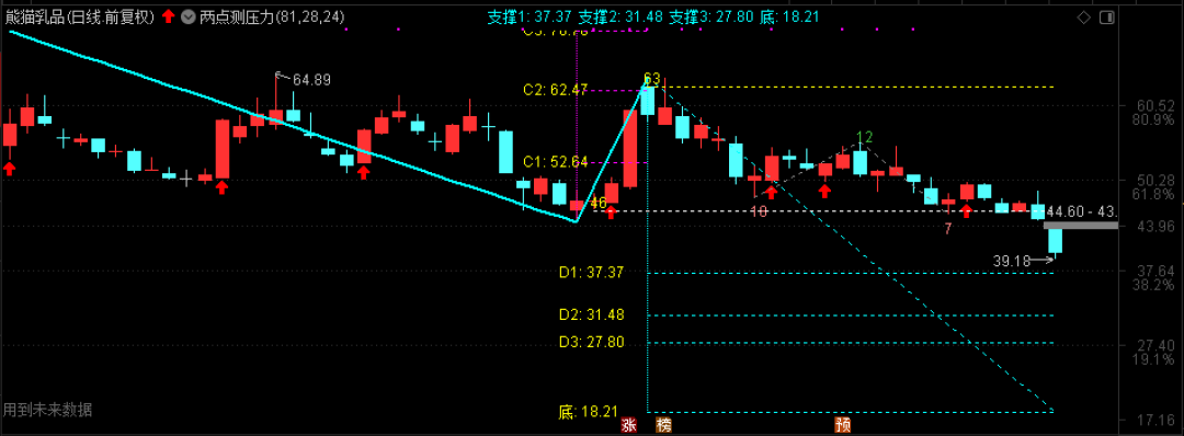 熊猫乳品今天出现下跳,盘中最低探至39.18元。通过结构预测来看,该股下档D1支撑在37.37元,如果在这个位置附近能够企稳的话,我们就可以通过高点和低点的连接,测算出其股价反弹的第1压力位,这样当股价反弹第一压力位而无法站稳的时候,我们可以考虑先行减仓出局,然后在下档支撑位附近等着再次买入的机会。
