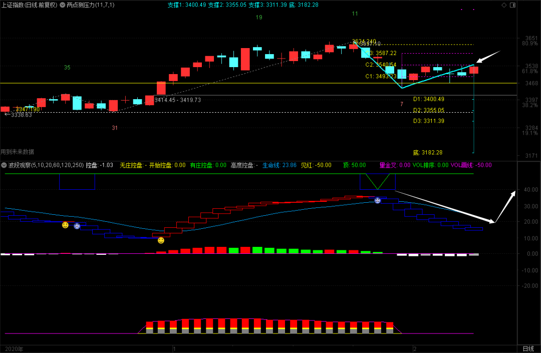 今天大盘收上了60分钟二号线3523.71,但比较遗憾的是没有收上3540.54,前面我预计指数会有对3581的反抽,在春节前最后两个交易日,能不能成行尚未可知。明天上主板市场多空分水岭在3565.35,如果没有强有力的资金做推动,估计突破站稳的难度还是比较大的。所以,搞不好要在明天出局资金压力释放完毕后,大盘才会有一个比较明朗的预期。