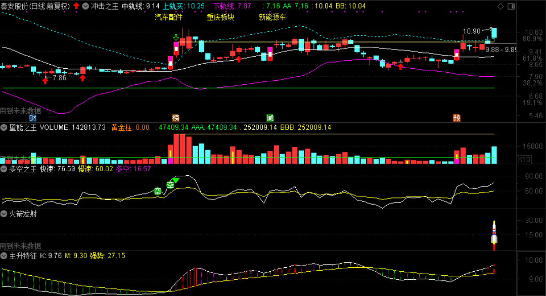 上一交易日按照火箭发射买入的主升特征股秦安股份,根本没想到今天开盘会直接开在涨停板。上一个交易日在上轨买入价格是10.25元附近,所以一看到涨停板就直接集合竞价抛出去了。后面会怎么样不知道,但我总觉得这种方法不错,寻找到相对强势股,在主图上轨买附近介入,如果临近BB线的话,也可以考虑再次加仓,目前看效果还是非常不错!