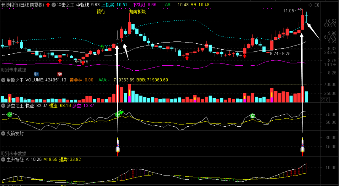 用和天山铝业买入差不多的方法,今天前市10.45元买入了长沙银行。该股也是上个交易日的火箭发射信号,回踩上轨买入价格10.51元,正好想买入的时候是10.45元,所以就毫不犹豫的建了个仓。股价收盘在10.75元,接下来如果不能够出现向上的发射,一旦跌破上轨买入价格,就要考虑是不是要先离场观望。