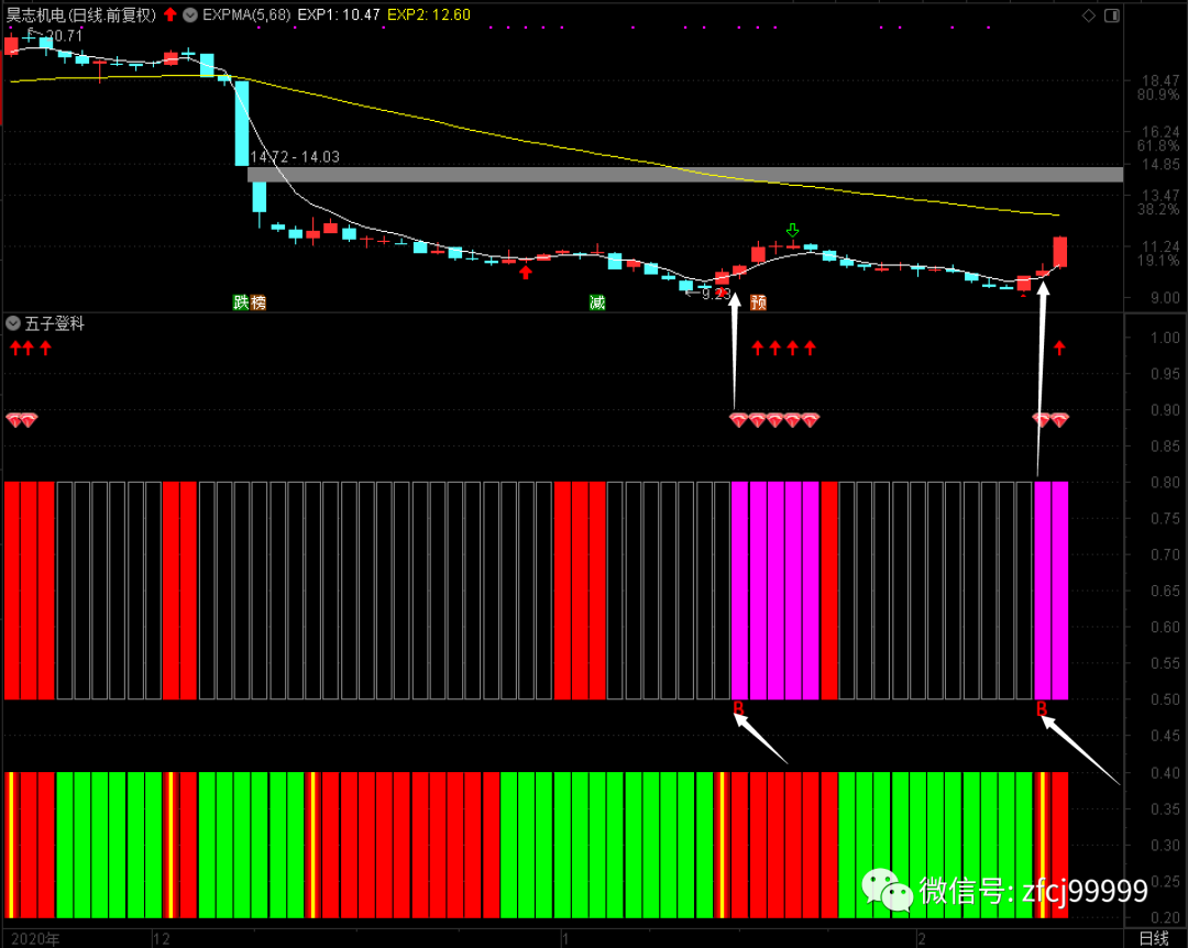 昨天讲完五子登科技术用法之后,有股友问我300503昊志电机2月10日他买入的,怎么看?我告诉他好好看看我讲课时的用法,五子登科当B点发出的时候,是可以在5日指数平均线上逢低买入,但之后一定要注意观察该线会不会跌破,因为是抄底的一种买法,并非是5个指标全部符合,所以多多少少会有一点风险,但成功获利了结的概率也非常大!
