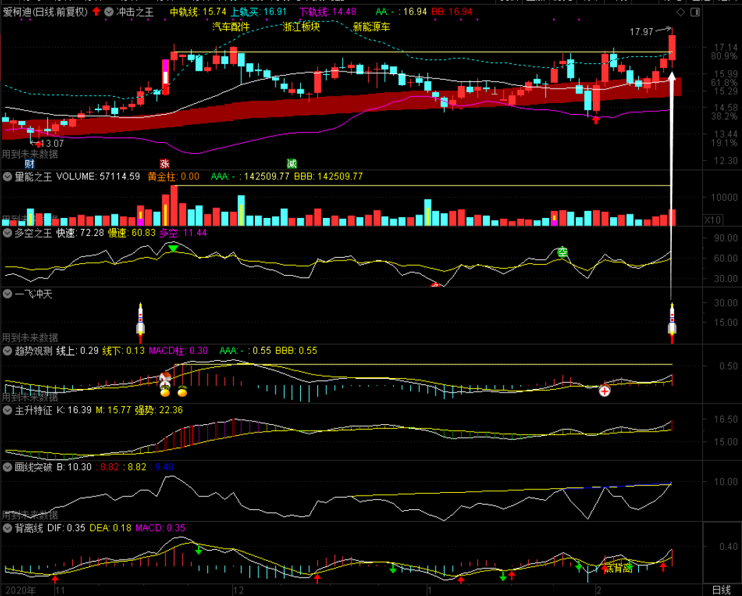 今天午后,我推送的红包股和上一只个股类似,爱柯迪我的买入价格是16.94元,从各项指标来看都还算不错,虽然尾盘有所回落,但基本态势是突破了一个长期平台。估计下周应该还有继续上冲的能力,新的方法选股可以互相结合,但我觉得你按照哪一种方法买入?一定要按照哪一种方法卖出否则很容易混淆!