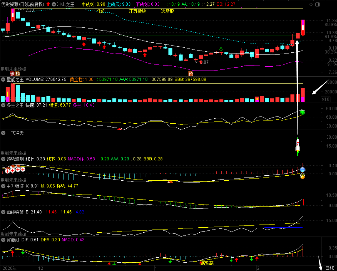 昨天在旗舰版用户群提到了优彩资源,当时除了一飞冲天的信号之外。我看到还有一个主升特征信号,而且背离线也走得非常不错。然后就把图贴到了群里给大家参考,今天该股最终封上了涨停板,有的股友看多空之王有绿色三角高抛信号,就直接获利了结了。其实,这也无可厚非,有把握能力的今天抛1/2,明天再抛1/2也可以!