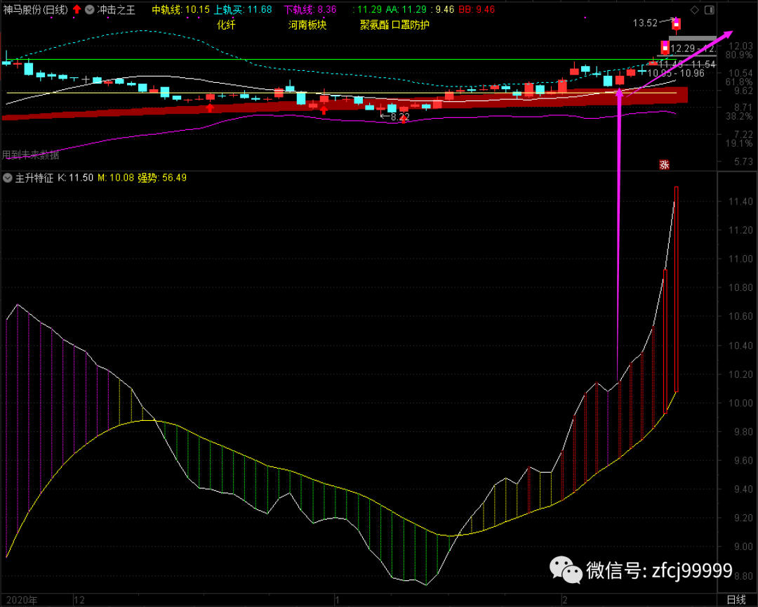 神马股份是节前发现的主升特征品种,我在2月2日10.76元做了买入,没想到连续下跌了三天,我在跌破10.22元时做了止损。2月8日该股再度发出主声浪特征信号,我在10.40尾盘再度买回,然后该股按照主升特征指标逐渐走高,直到今天封于13.52元涨停板,由于日线多空之王有高抛信号。所以尾盘我选择了高抛出局,由于持仓并不是太大,所以就当个开胃菜吧!