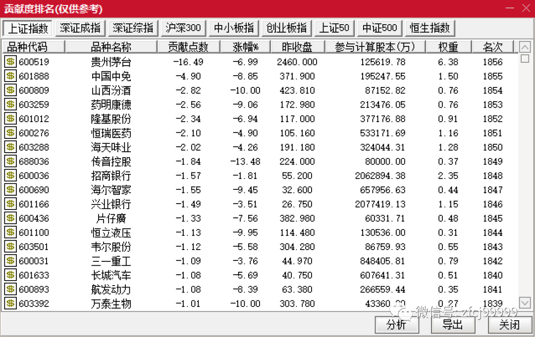 贵州茅台今天大跌-6.99%,从个股贡献度排名上来看,今天沪指跌了53.73点,茅台贡献了16.49个点。如果再加上中国中免、山西汾酒、药明康德、隆基股份、恒瑞医药和海天味业的话,这些个股一共贡献了33.33点下跌,机构抱团股的分崩离析,其实从操作角度讲,是一件非常好的事情,因为这样可以让成长类的中小盘股,得到进一步表现的机会。