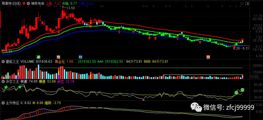 氮化镓家龙头易事特,今天表现不错,整个氮化镓板块今天资金净流入+1.88亿,资金流入迹象非常明显,易事特资金净流入超过+5,182万。从日线级别神奇布林指标来看, A股已经突破上轨7.27元,而且是带量突破的,如果短期能够继续放量将上轨扭转拉起,那么主升特征指标将出现鱼头特征,如果能够坚持继续走上去,或会发动一波新的行情。