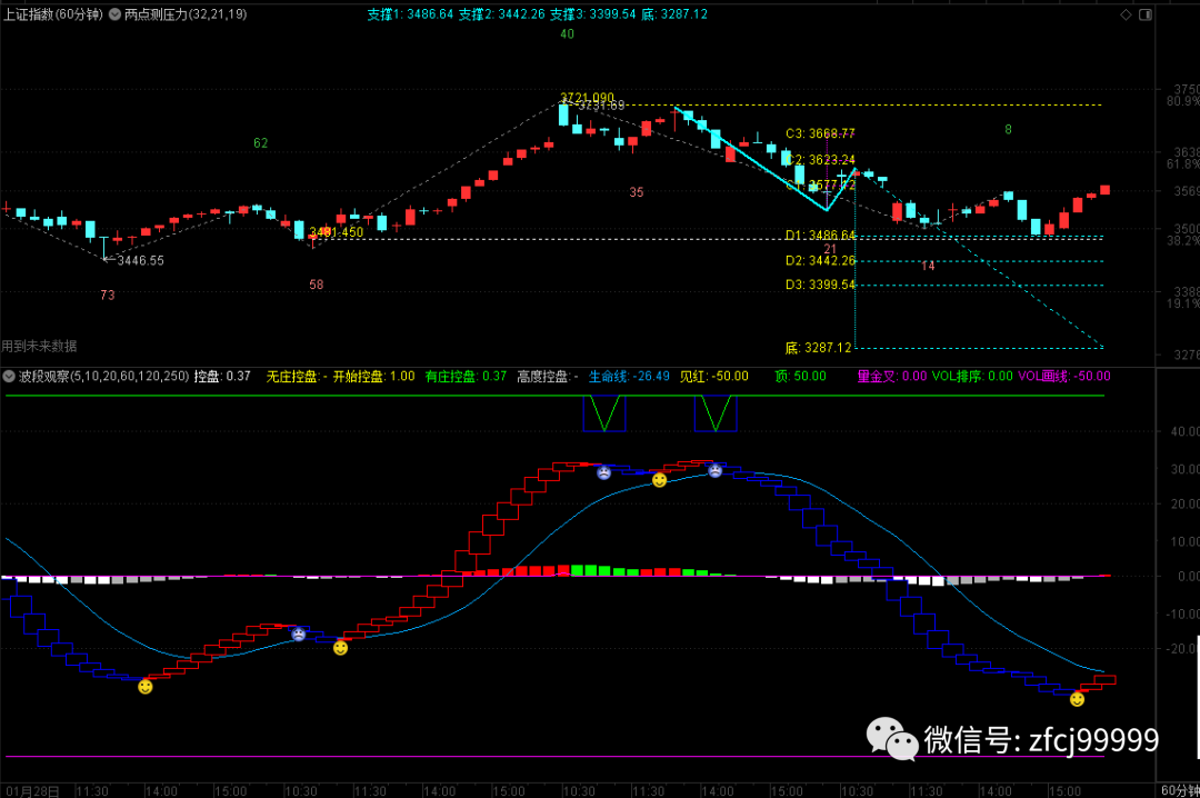 昨天下午很多人都担心大盘,我这60分钟画了一个上证指数结构图。告诉大家第1个支撑在3486附近,结果还真的神奇的在这里止跌了,到今天收盘,已经反弹了90多个点。如果没有外围不利消息刺激的话,预计这个反弹还将延续,毕竟前市第2个小时就开始翻多,60分钟也收上了二号线。