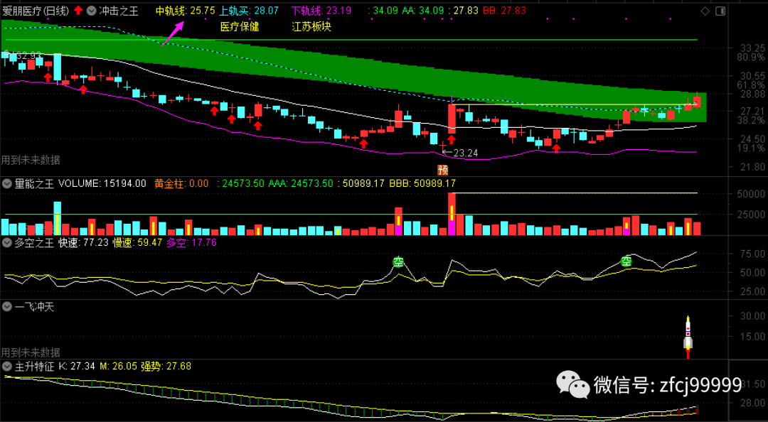 今天上午直播的时候,有个旗舰版的学员问我爱朋医疗,我当时就给了肯定的答案。因为最近他问过我几只股票,在慢慢的感觉中我发现,他基本上已经开始会选股了。就上面这只股票来说,昨天一飞冲天的信号,加上主升特征的信号,就算买在比27.83元黄色盘整线高一些,其实也是没有太大问题的。只要后面量能够起来,连续上去打34都是问题不大的。