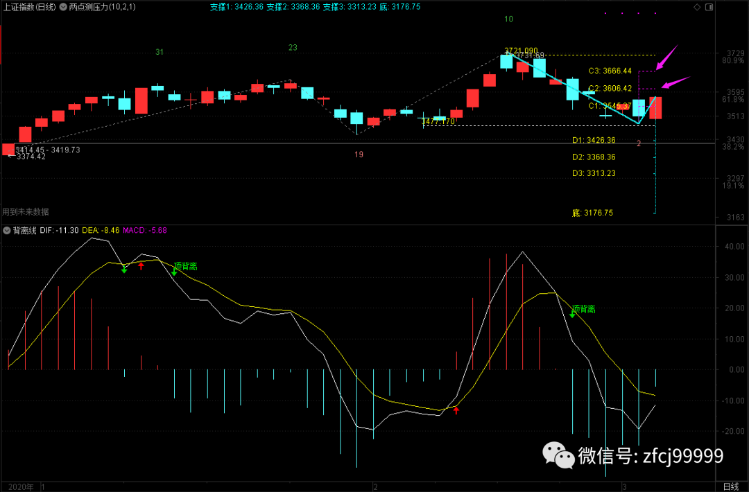 从大盘日线级别来看,在反弹结构图中,3606.42和3666.44将是接下来最大的两个压力位。如果没有意外情况的话,C2位置3606.42应该能够到,站稳了再往上面继续看,否则做短线的就要注意先逢高获利了结一下,别人怎么讲我管不到,纯技术角度我就是这么看的,仅供大家参考!