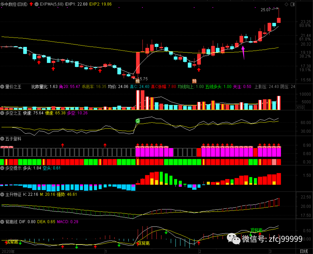 2月19日根据主升特征提示,我送出了红包股华中数控,今天股价最多冲到了25.07元,主升强度已经到了46.61,盘中高抛点在分时上是24.97元,不知道多少朋友把握住了这个高抛点,虽然还在沿着5日指数平均线上行,但在今后的操作中,大家一定要注意,如果股价和5日指数平均线偏离较多,短线减仓或落袋为安最好!时间关系我先写到这里,稍后一直播有讲课,记得来听一下!