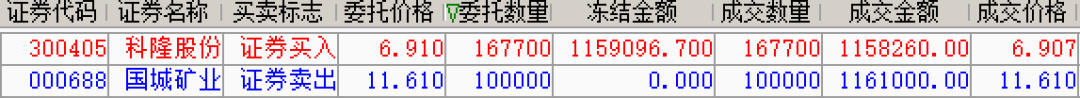 今天在11.61元委托卖出了10万股国城矿业,成交后在6.91元买入167700股科隆股份,主要就是为了给持仓做个T+0。按计划6.91元买入,7.08元就可以做盘中止盈,但我最终止盈的价格是7.13~7.08元,只有一小部分最后卖在了7.08元,大多数都在7.11元或以上,这个T+0是成功的!