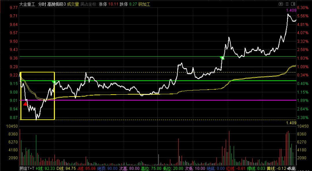 早盘在9.01元参与了一点儿大金重工。这只股票观察有几天了,原本就想在5日指数平均线附近介入,没想到会低开快速下探。所以分时9.01元买入后,我也没有特别的慌张。毕竟技术上的态势还是不错的,只要有机会继续向上发挥,那么这个态势就会相应的延长一段时间。