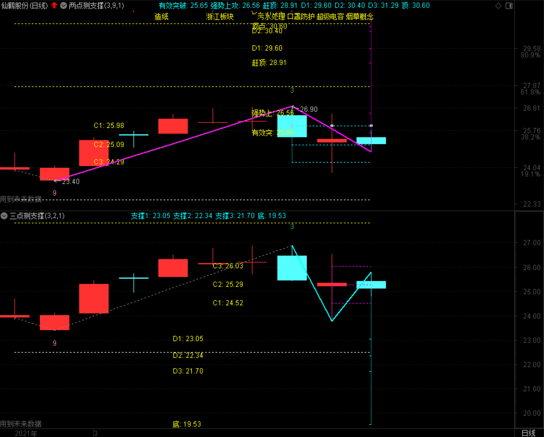盘后有朋友问我仙鹤股份该如何操作?我画了一张该股日线结构图,发现就算昨天你是26元买入的,只要在25.09元附近加两成仓位,你的平均成本也就是25.39元左右。该股反弹压力位25.29和26.03元,25.09元是C2支撑位的位置,该位置不有效跌破,就可以继续持股待涨。而且高考的压力位也非常的明确,主要就看你自己怎么把握!