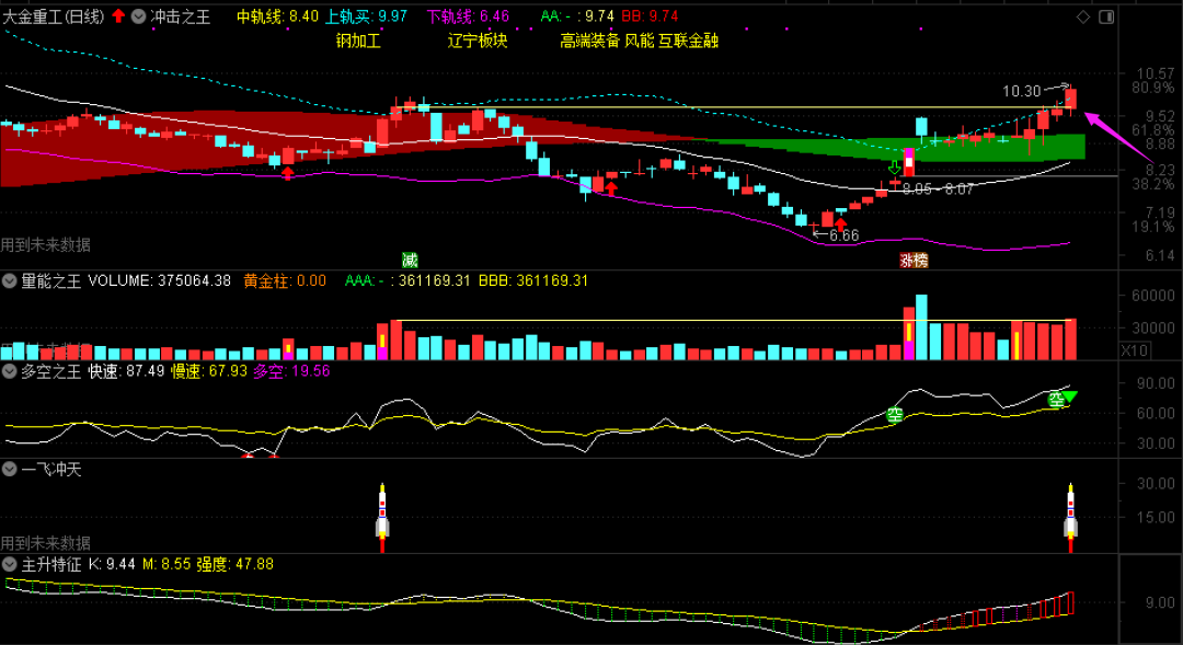 002487大金重工是今天午后的红包股,我是午后9.74元买入的。这只个股在之前的几天中,是我旗舰版群反复提及的品种,有些人已经注意到了,可有些人并没有重视起来。今天多空之王出现了一个高抛信号,一飞冲天有一个火箭信号,出生特征强度47.88,买入就是想做一个短期向上的快速突破,看看下周一能不能给一个意外的惊喜!