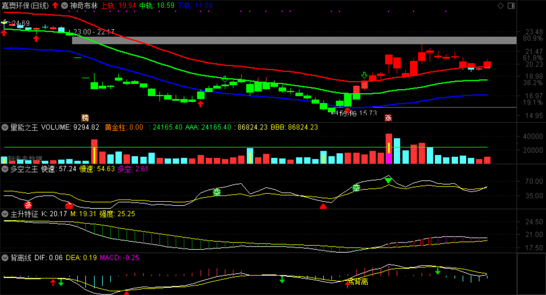 今天上午的红包股是嘉澳环保,我是在布林上轨19.94元买入的,环保工程短期表现的非常强势,而该股前期向上突破后回踩,目前看上去有结束的迹象,虽然主升特征的强度只有25.25,但如果能够向上拉起,伴随有放量的话,这只个股的短期还是值得期待的。你觉得呢?欢迎文后留言探讨!
