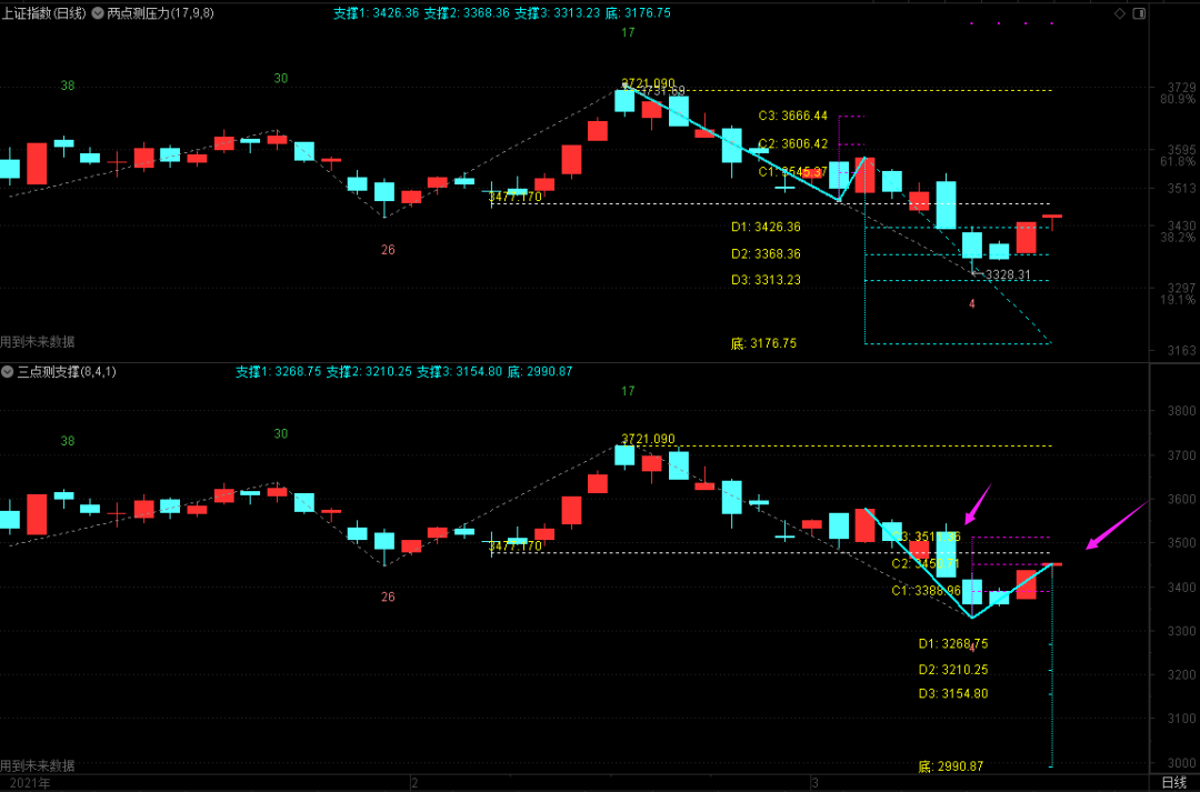 今天大盘整体还在预期之中,收盘突破了C2压力位3450.71。昨天我讲过,想要发生质变的话,必须要突破3511.36,没有完全有效突破之前,就先当反弹来看就好。如果3511.36被触及或突破后再度跌穿,那么短线的这个反弹也就结束了。当然,日线的安全抄底信号依旧有效,因为这个信号一旦出现的话,就算怎么纠结周折,最后还是会涨上去的。
