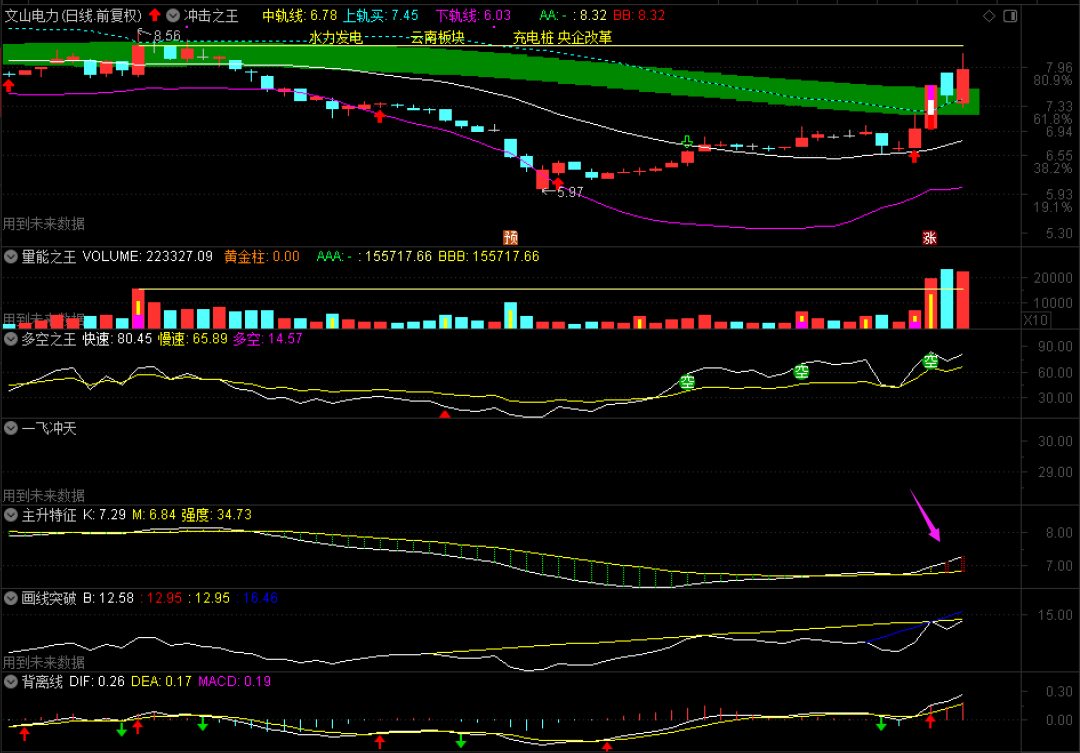 昨天红包股推送的是文山电力,预警价格是7.52元,昨日午后有大把时间做买入。今天该股最低探到7.31元,也是上轨买入的极佳价位,盘中股价最高冲到8.18元,短线获利超过+8.77%。选择该股主要是多空之王,昨日一度发出高抛绿三角信号,此类股发出绿三角信号结合主升特征指标,通常会捕捉到短线爆发力较强的个股,以前在讲课的时候我也讲过。