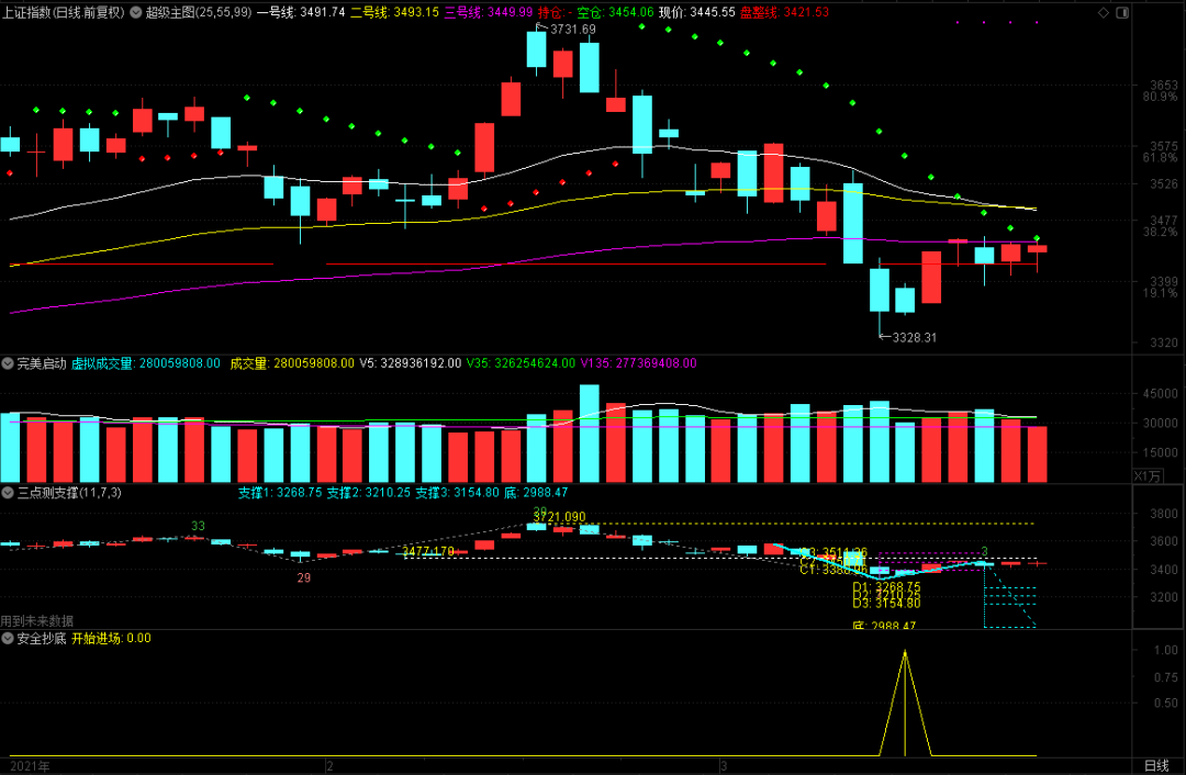 今天大盘又磨叽了一天,虽然有电子元器件、家电、农业股在搅和,但小泥鳅很难翻起大浪来,所以盘中的震荡还是很明显。从收盘的情况来看,3454.06是明天的多空转换点,这个点位只要突破0.01点,那日线级别将完成由空翻多的变盘,既然没有能力进行主动性突破,只要完成被动性突破,也可以让大盘向上走一个升浪,原则上也是不错的!