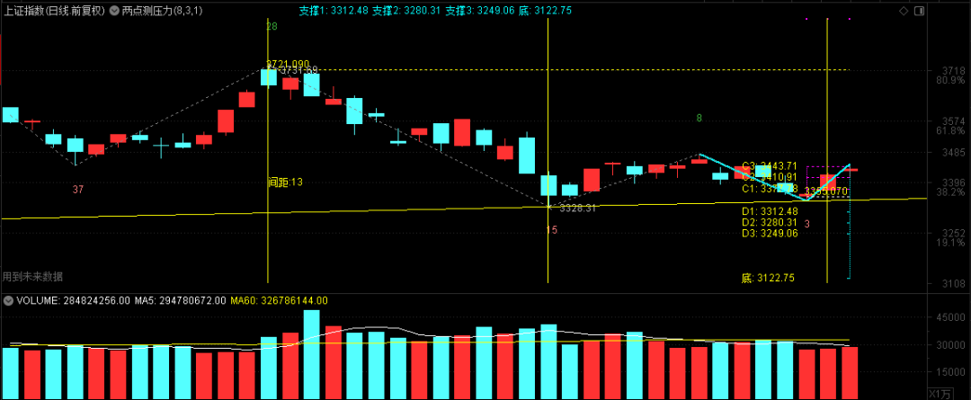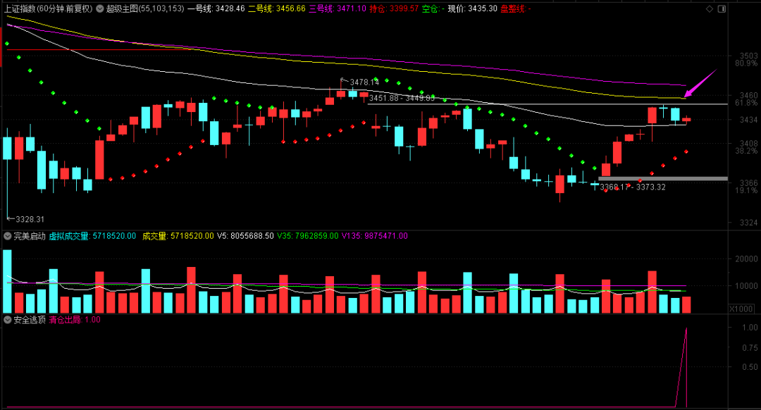 尾盘60分钟安全逃顶信号一直在不断的闪现,最终收盘固定下来。虽然该信号只是一个辅助研判指标,但不得不说,一旦出现的时候,短期接下来都容易形成高点。60分钟二号线在3456.66,这个二号线不突破站稳的话,整个市场都很难再度出现走好,所以从观察角度讲,这也是一个研判市场强弱的最有效手段,大家不妨也进行一下参考。