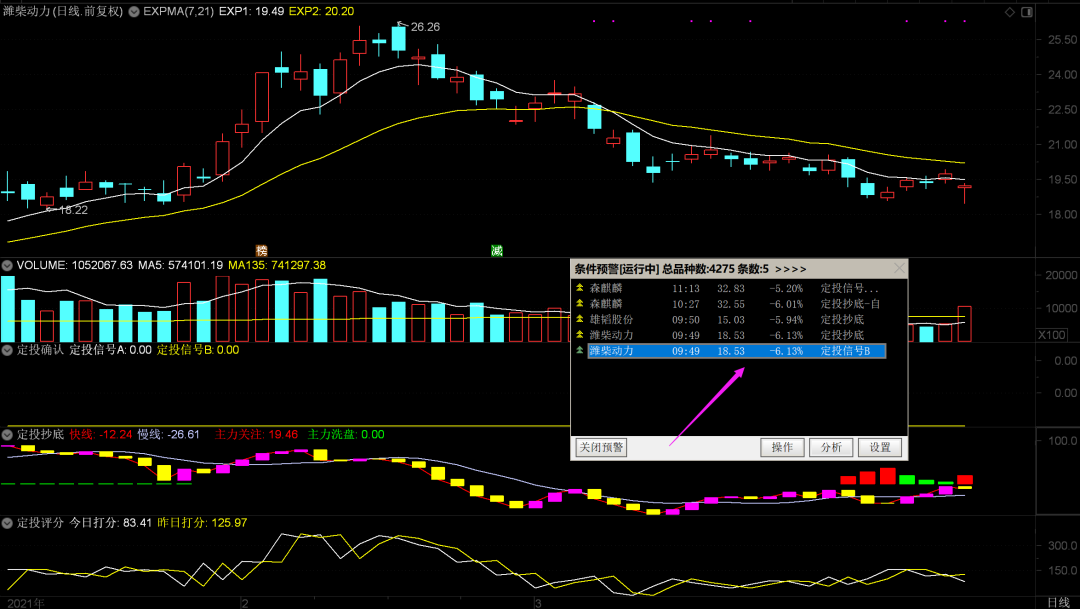 今天前市9:49分18.53元定投抄底预警了潍柴动力,如果直接干进去的话,到今天收盘,获利已经超过+3.83%。可能有些人看不上这种小钱,但从我个人的角度讲,想做一个快乐的炒股者,这个方法是必须要学的,因为它不管市场的好与坏,它只管买入个股大概率的赚钱,说的再多也没用,以后一起慢慢看吧!