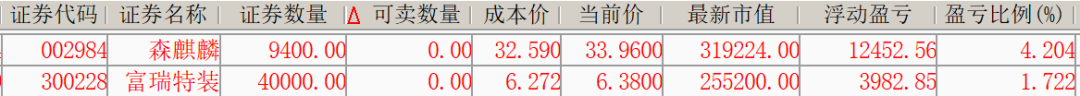 今天森麒麟32.55元发出并投抄底预警,我看了一眼分时图,在32.58元实验性买入9400股,结果收盘获利超过+4.20%。我相信随着研究的深入,这将成为A股市场中最稳定的赚钱方法。此外,富瑞特装今天挂单在6.55元,差0.01元未能成交,本来想改个单子先高抛,后来想想昨天买的,再看看也可以,不知道接下来该股能不能突破6.55元?