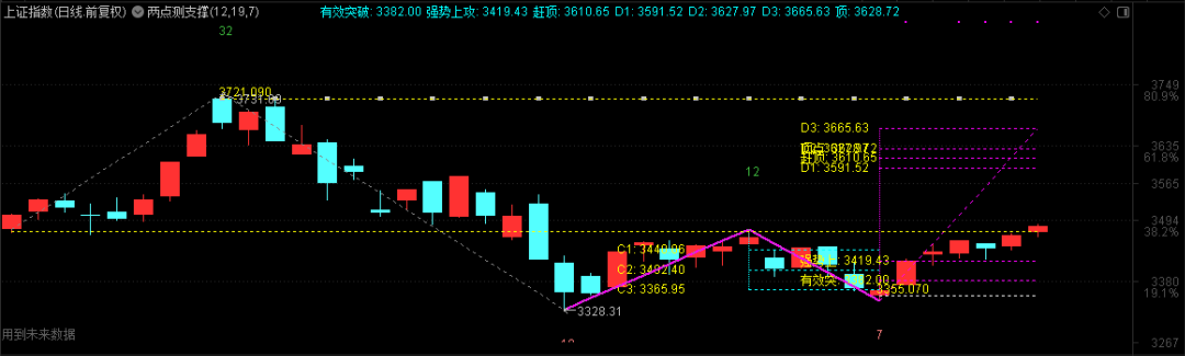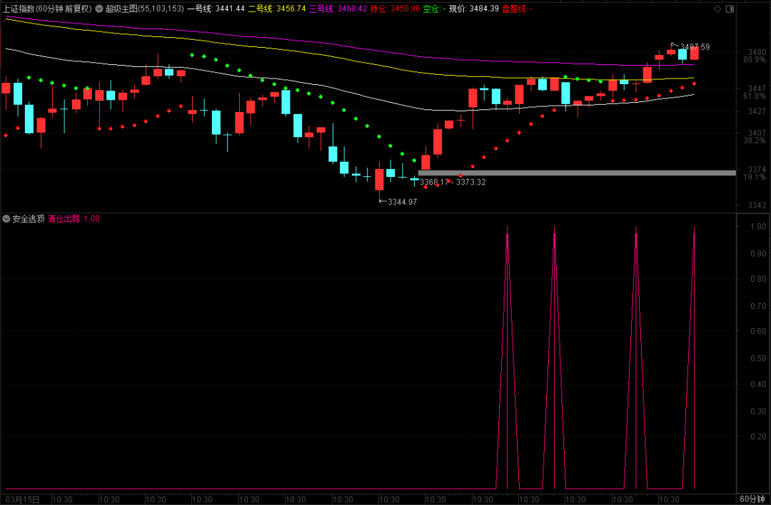 尾盘60分钟又出现一个安全逃顶信号,基本理解就是:要么尾盘就是近期反弹的高点;要么节后开盘还能继续上冲两个小时。结合顶底之王指标来看,如果该指标不在高位死叉的话,就有可能是再向上冲两个小时。当然,这也是仁者见仁智者见智的。毕竟现在市场有了一点儿强势初露的感觉,保不齐节后还有一个大阳线呢!