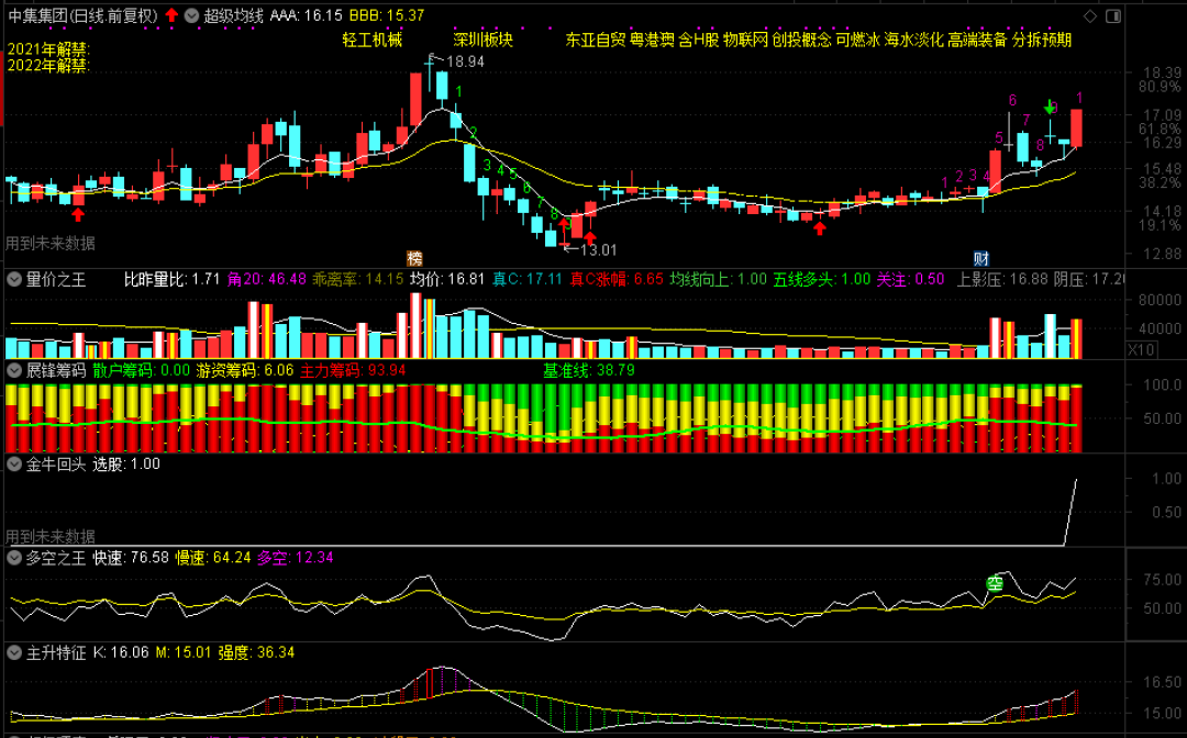 昨天收盘锁定了三只个股,今天开盘买入了一只,没有大的奇迹发生。第2只作为红包股进行了分享推送,只要逢低去买入的话,就算不红盘报收,也是有那么一点儿利润的。第3只就是上图的中集集团,今天正好打在了7日指数平均线上,然后快速的拉了起来,敢于买的话,收盘有一块多钱的收益,而且还有金牛回头和主升特征信号,此类形态个股,都值得重点关注。