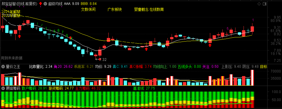 邦宝益智是4月1日分享的红包股,哪怕你买在9.18元,只要知道在21日指数平均线附近加两成仓位,今天的上冲都能获得一个很好的收益。其实有些时候,买股票要有相对的策略,该加仓的时候坚决不能手软,也没必要非要定在21日指数平均线上才买,在附近买入之后,盘中如果有冲击机会的话,可以先高抛获利了结一成仓,这样做起来更加的灵活!今天就写到这儿, A股没有什么太多可担心的,现在的一切的折腾,都是为上涨做准备,其他的不要想的太多,就这!