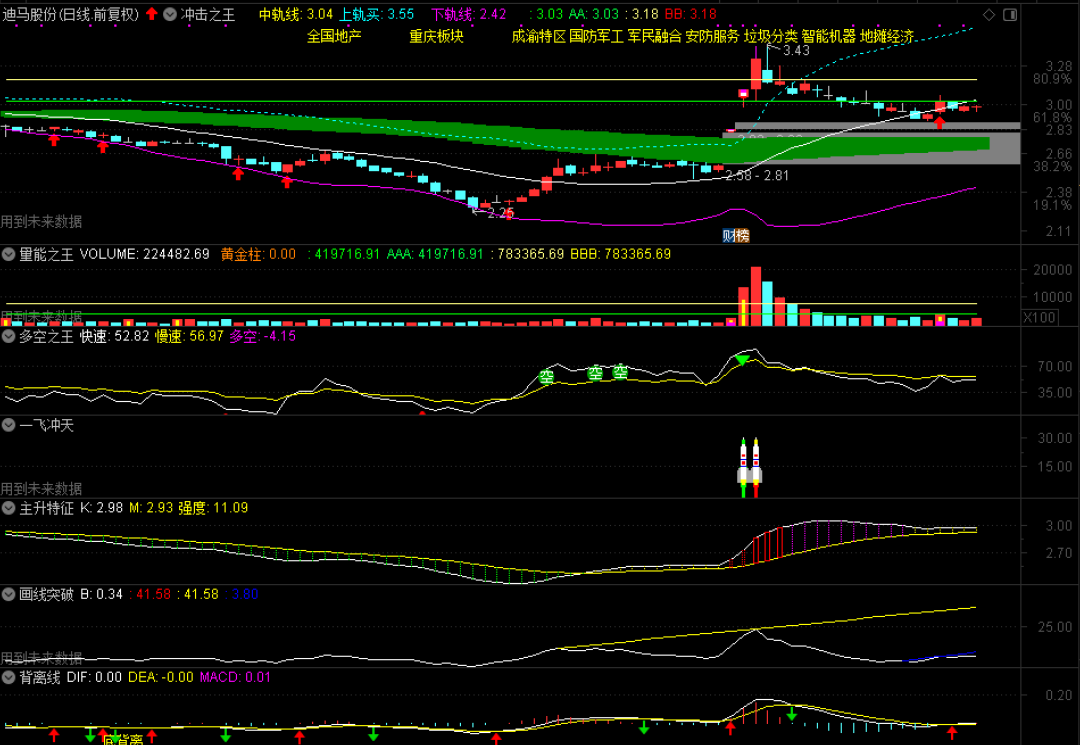 今天迪马股份表现的一般,在直播时我多次提过该股,不少朋友很纳闷,为什么不涨?其实从冲击之王指标来看,该股上面有两个平台,分别在3.03和3.18元。只有这两个平台被一蹴而就的突破了,那么这只个股才会开始快速的向上发动攻击。背离线指标在零轴附近金叉了三天,小周期里也是上涨第4天,看看本周有没有什么动作吧!暂时就先写这么多吧,晚上21点如果有时间的话,我会开个直播讲一讲自己对市场的看法,有兴趣的朋友别忘了过来听听~~