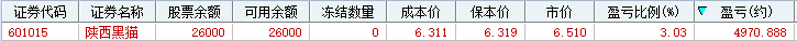 昨天定投抄底买入了陕西黑猫,介入价格是6.49元,出局止盈设定价格是6.68元,前市该股在快速下落的时候,我在6.31元用其它账户做了买入,收盘盈利+3.03%。可能有人会问我买入的目的是什么?其实,我就是想再探索一条获利途径,不迎着大幅的下跌直接去买,次日低于信号价格很多的时候介入,会不会获得更高额的利润?实验会继续,真金白银的练习!