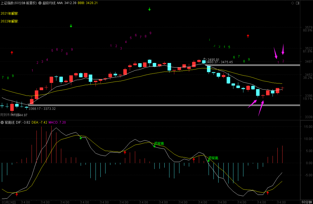 昨天讲课的时候,提到了小时级别的4个收盘价,下午第1个小时指数收盘终于站在了3395.28之上,这意味着小时级别的小周期上涨开始,明天上午第1个小时和下午第1个小时,需要特别留意。第1个小时如果能站在3409.78之上,就有小周期上涨3出现;下午第1小时要收在3416.04之上,这样原有的趋势才不会改变,否则中途很可能出现变数!