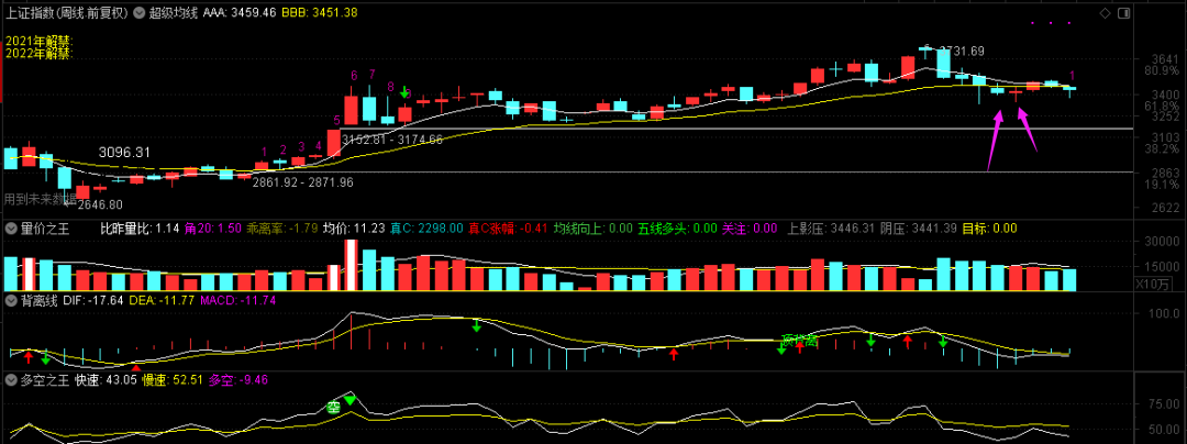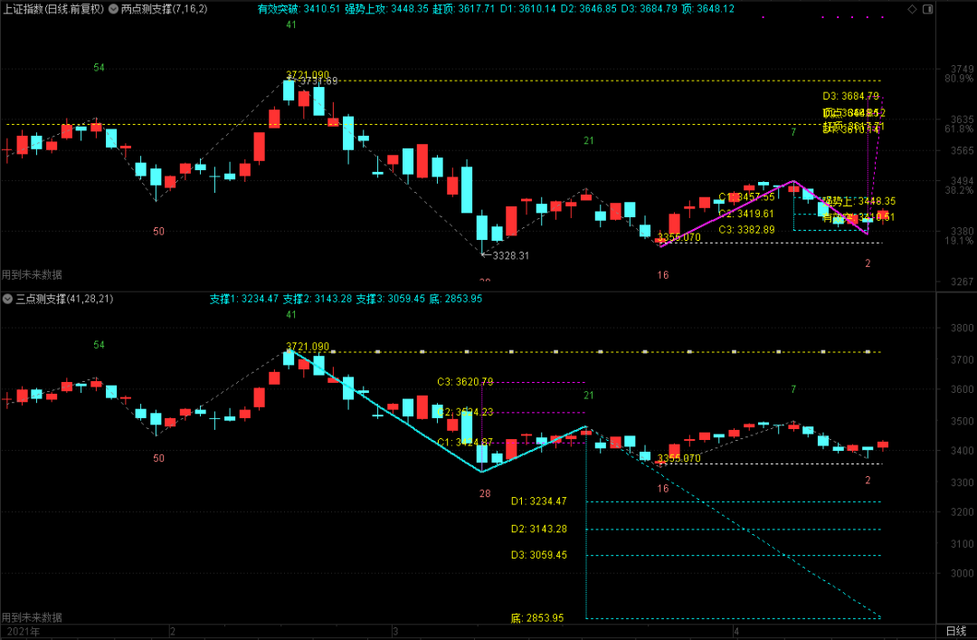昨天晚上讲课的时候说到了两个点,周线级别的3404.66,日线级别的3412.95,而且我告诉大家,指数如果收盘在3412.95之上,那么短期大盘将会出现小的上升周期1,最后指数收在3426.62,预计的东西全部完成。3396.47是下周一日线的关键点,周线的关键点在3418.33,只有维持其上运行,指数才会有更为积极的变化。