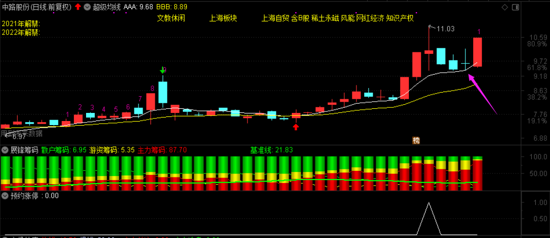 昨天上午在9.43元分享了中路股份,当时很多人并不理解我为什么要分享这只股票,其实这和我最近在研究的预约涨停选股系统有关。从图上看预约涨停的信号是在11.03元那一天,但实际的使用方法却是股价回靠超级均线才可以介入,昨天该股股价回踩7日指数平均线,就是一个极佳的买入良机,但今天我没有指挥好,为了买另一只股票,建议9.70附近就出局了!