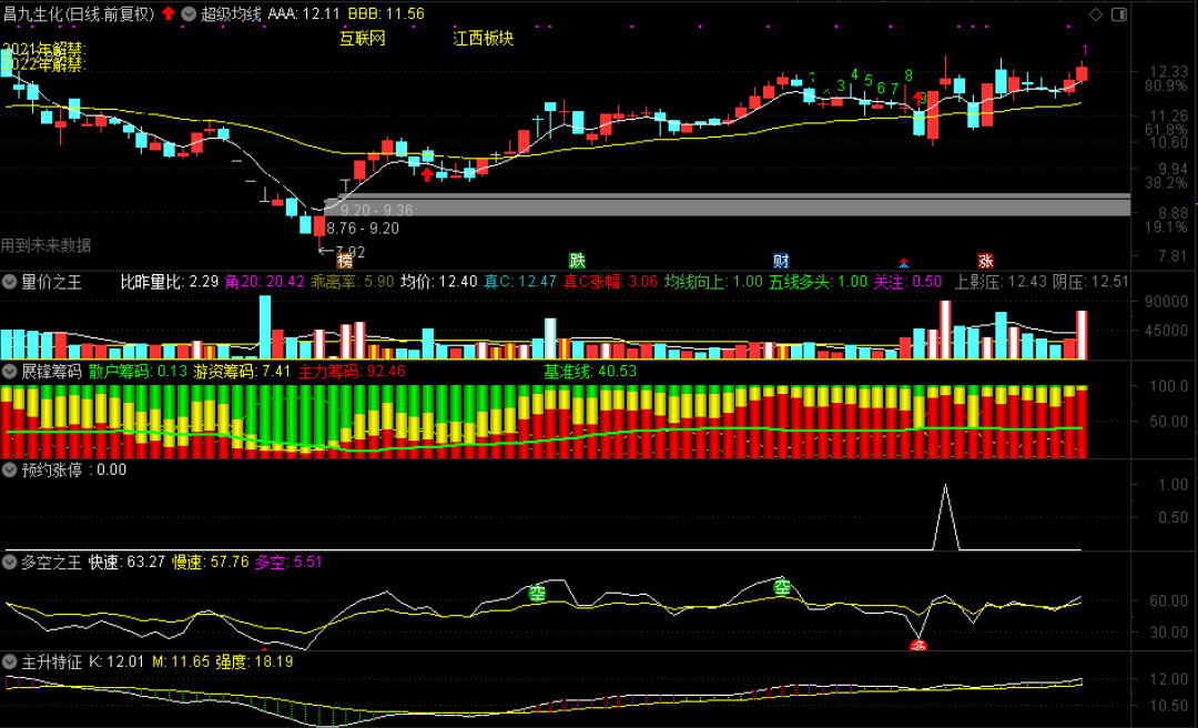昌九生化今天在12.58元我高抛了,其实它也是一只预约涨停股,只不过发动的有些慢而已,回收资金主要是想干一些其它的事情,不管下周它表现的怎么样,作为一只红包股,它已经完成了它的使命。虽然形态和各项指标依旧完好,但做股票千万别想着赚完最后一个铜板,有时候太贪,也可能是吃大亏的开始,这句话和股友们一起共勉!