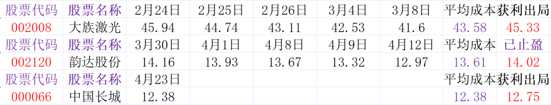 定投抄底之两路进军数据统计,今天韵达股份果真出现了脉冲上涨,最终封死在涨停板上,我们设定止盈价为14.02元,不管从哪个角度讲,这里卖出都是很轻松的,至于后期还能涨多少,和我们定投抄底无关。大族激光表现还是可以的,继续等待止盈出局。尾盘买入000066中国长城,为什么要买它呢?晚上讲课的时候再说~~