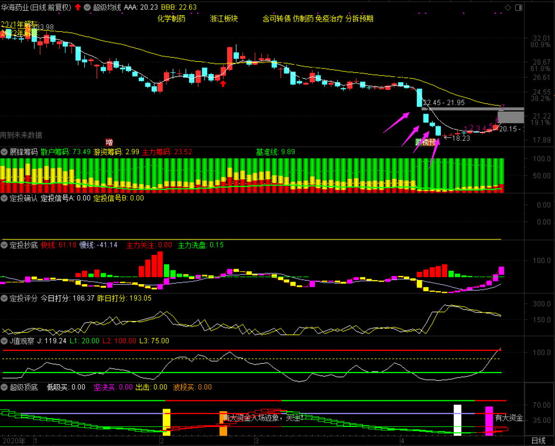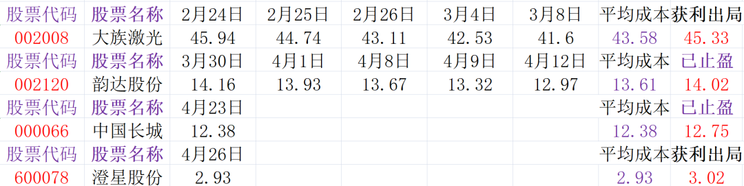 定投抄底盘中4月7日预警的华海药业,我连续参与了四次尾盘低买,平均成本20.22元左右,按3%止盈的话是20.83元,今天该股开盘21.95元涨停板,我在9:15直接挂卖24500股,获利超过+8%以上。这属于前期侥幸而为的品种,所以自然也就不能作数,盈利了是盈利了,但并没有真正的遵守操作规则,以后这样的操作还是要杜绝的,必须以尾盘参与为主!