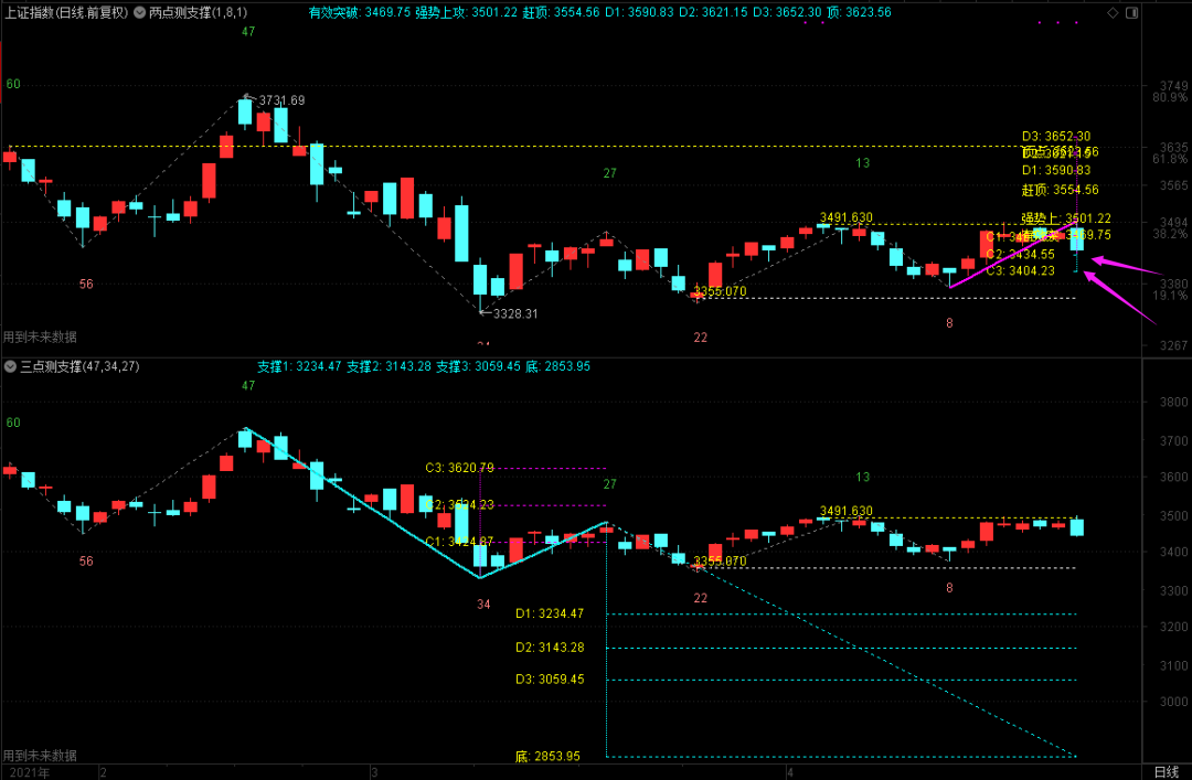 3409.61到今天的高点,画一根结构线,第一支撑3465.69已跌穿,第二、三支撑3434.55、3404.23,能撑住就有机会继续反弹。否则短期可能就会麻烦一些。因为从日线级别来看,第3个低点已经在4月15日形成,也就是说,不管怎么样,3373.09是不能被沽穿的,只要能较为正常的运行,本周也不排除有大阳突破的可能。